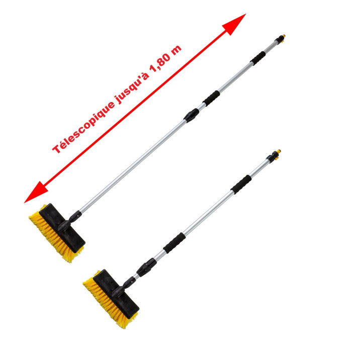 Brosse télescopique pour lavage auto. Idéale également pour les caravanes, camions, bus, tracteurs, bateaux, etc. Le manche télescopique est sorti en un tour de mains pour atteindre 1,80 mètres.